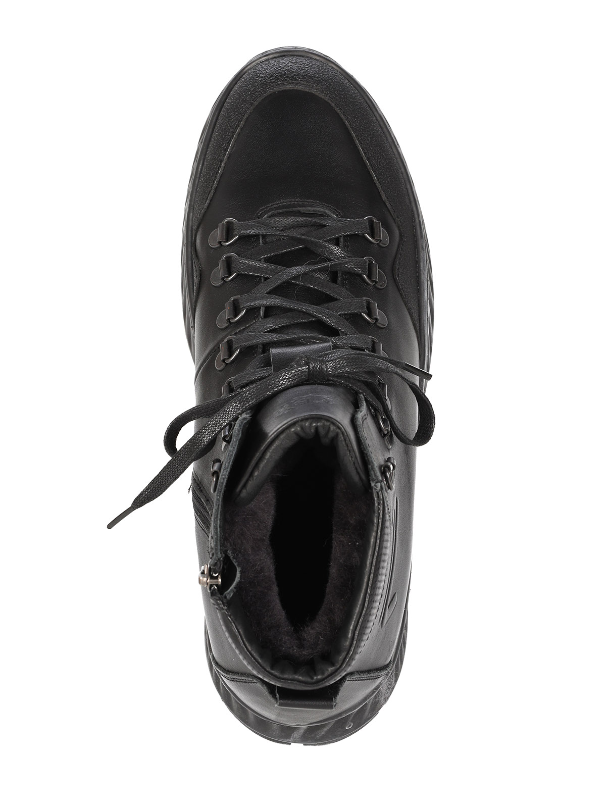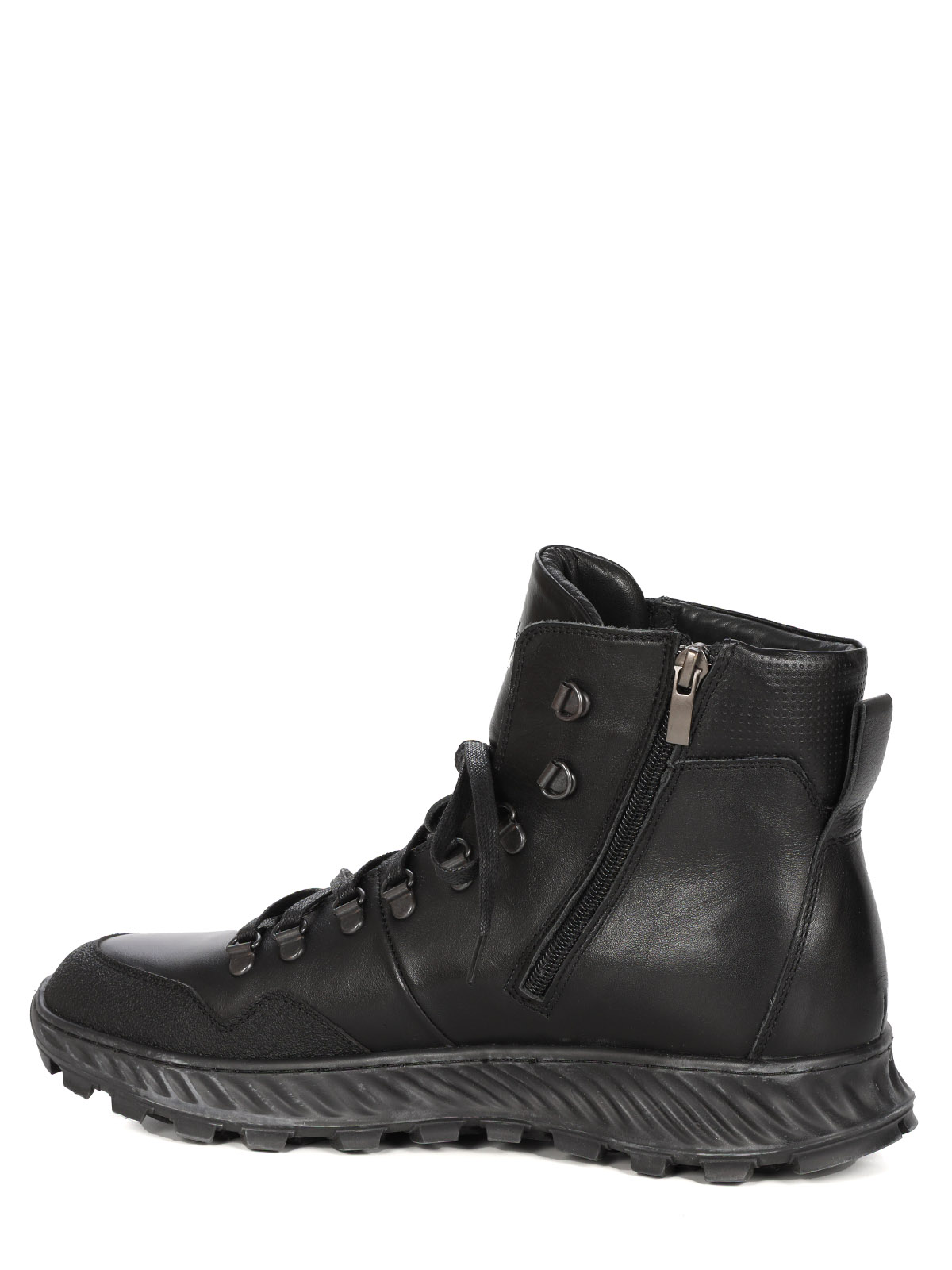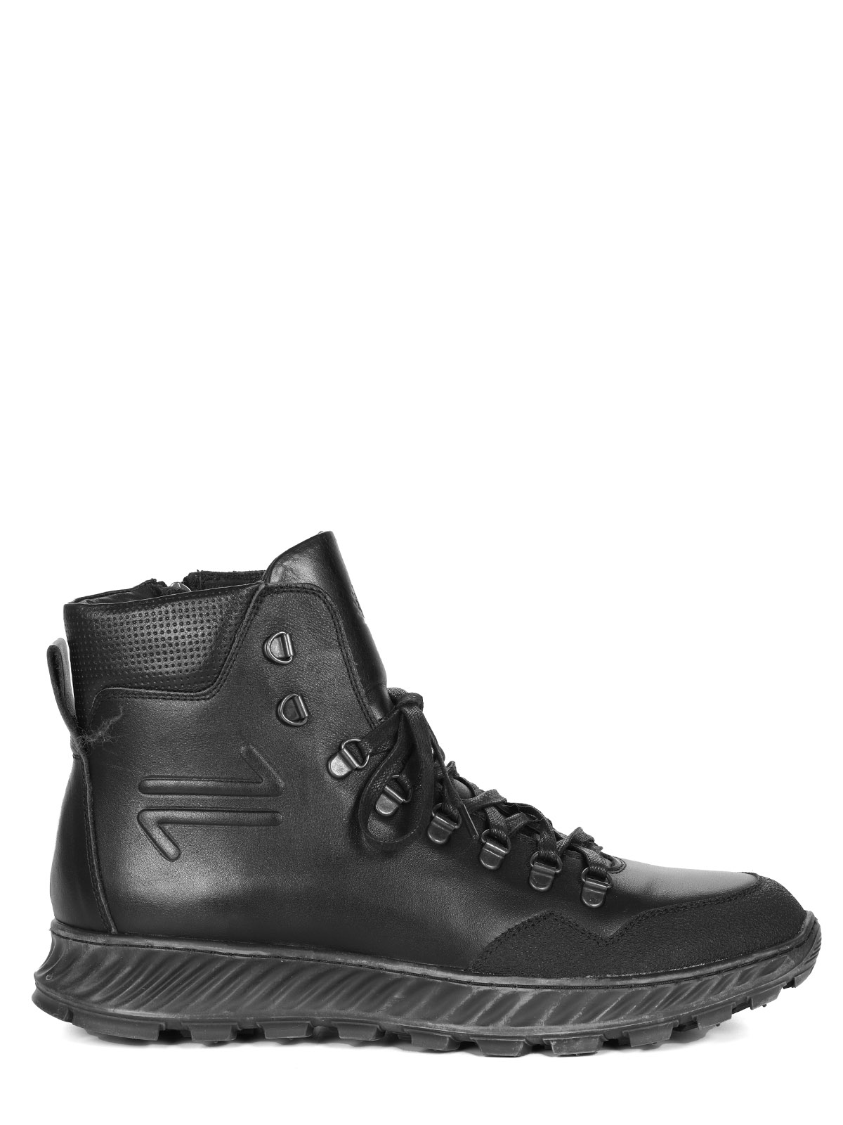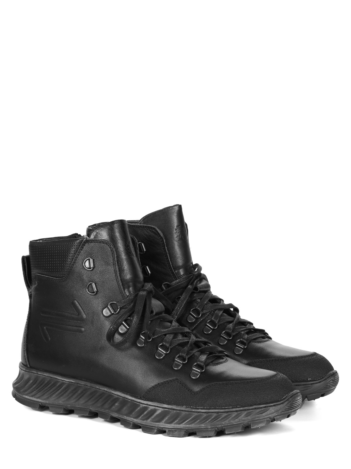 Мужские черные ботинки выполнены из натуральной кожи. Внутри - тёплая подкладка из натуральной шерсти для защиты от холода. На подошве есть глубокий протектор для надёжного сцепления с любой поверхностью и предотвращения скольжения.