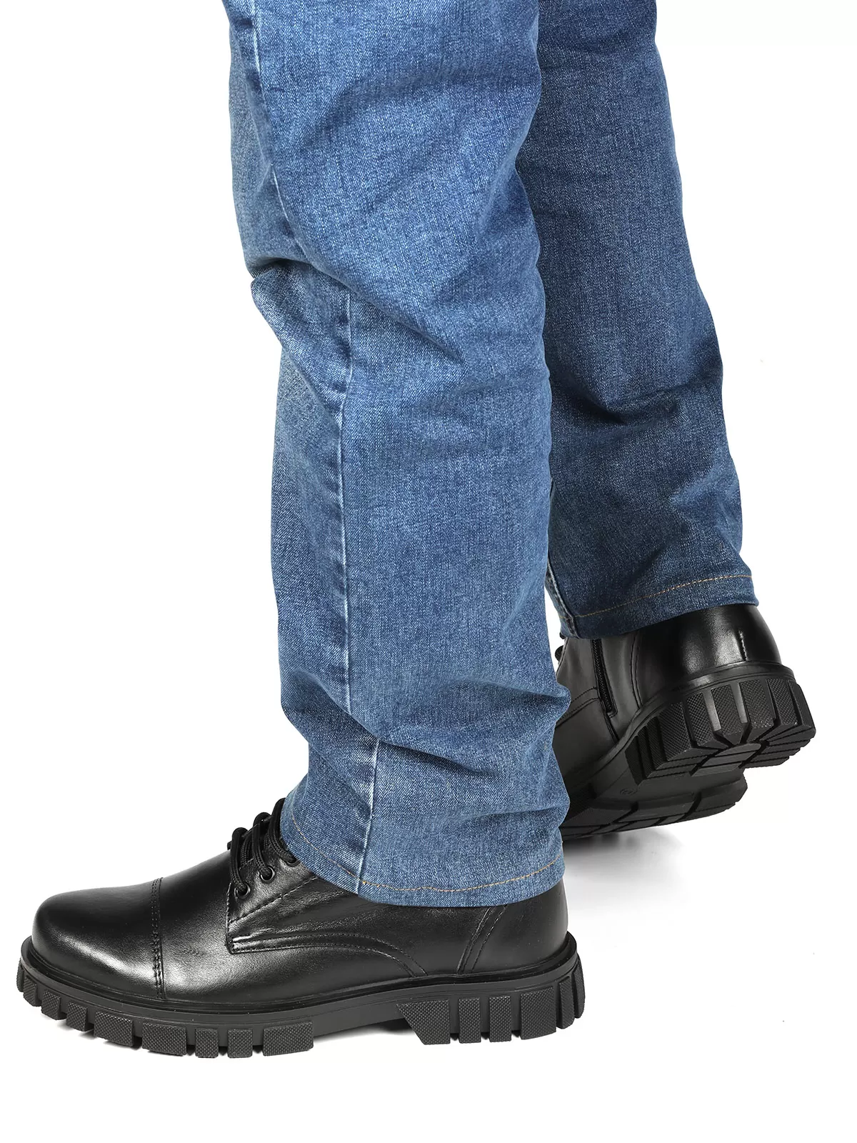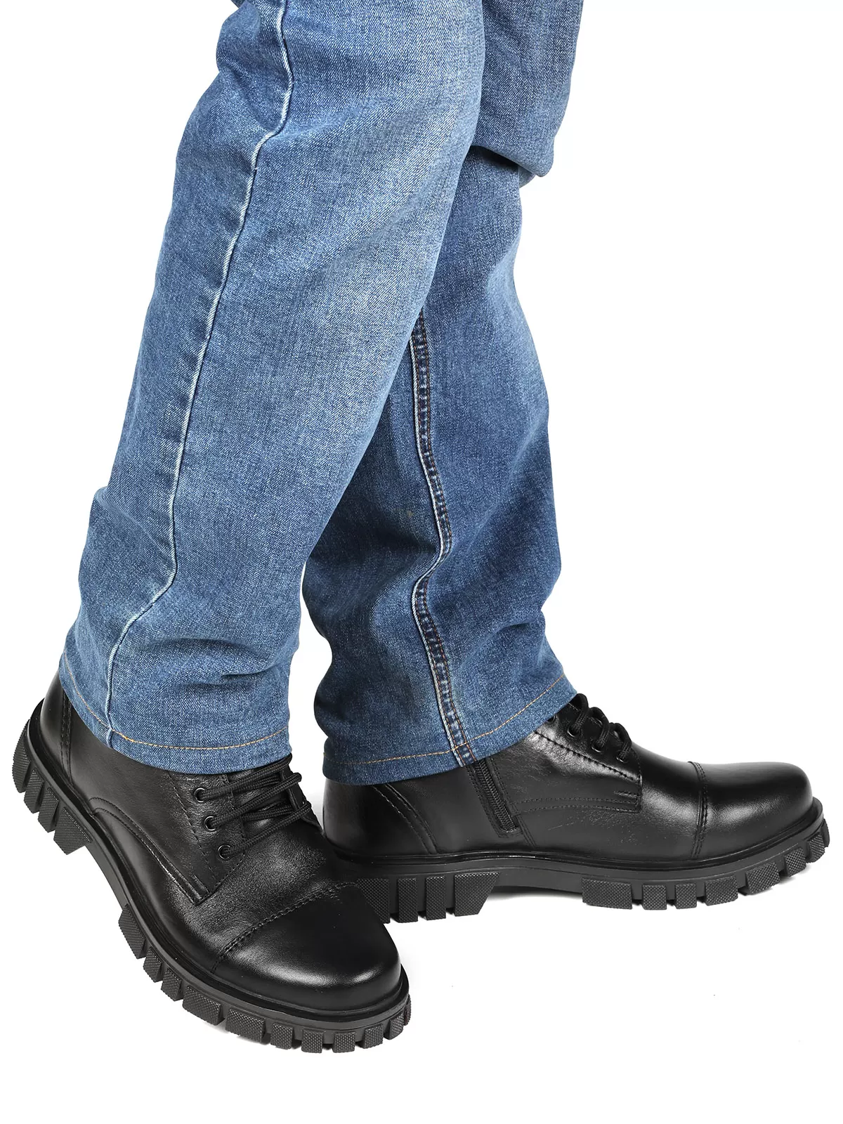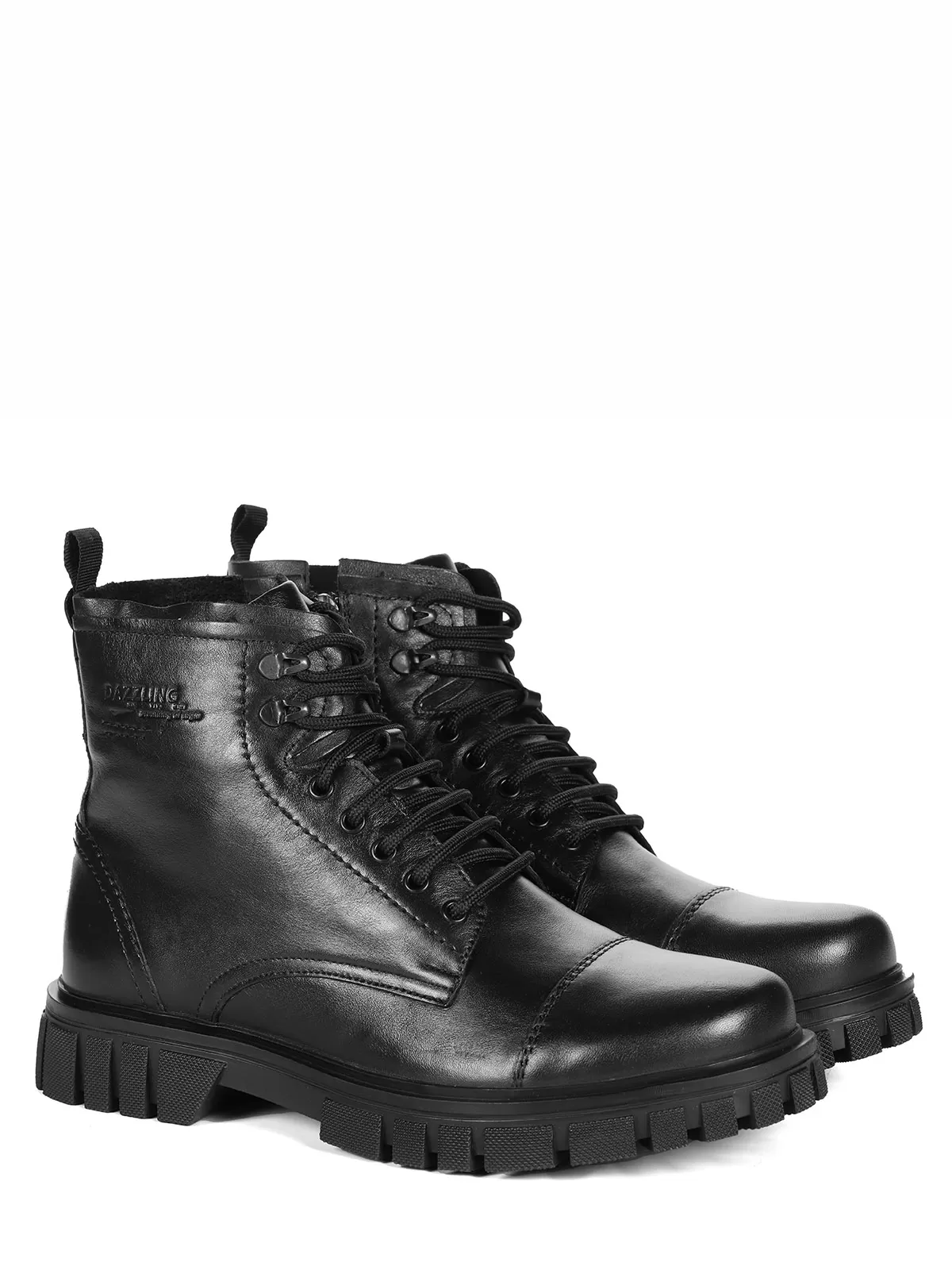 Мужские черные ботинки выполнены из натуральной кожи. Внутри - тёплая подкладка из натуральной шерсти для защиты от холода. На подошве есть глубокий протектор для надёжного сцепления с любой поверхностью и предотвращения скольжения.