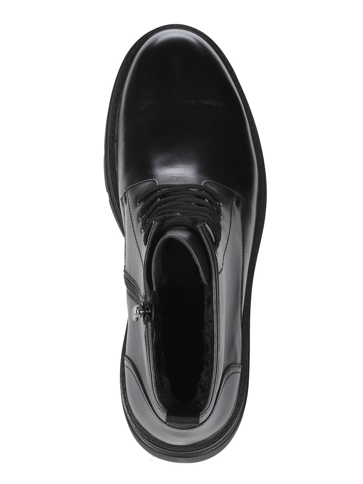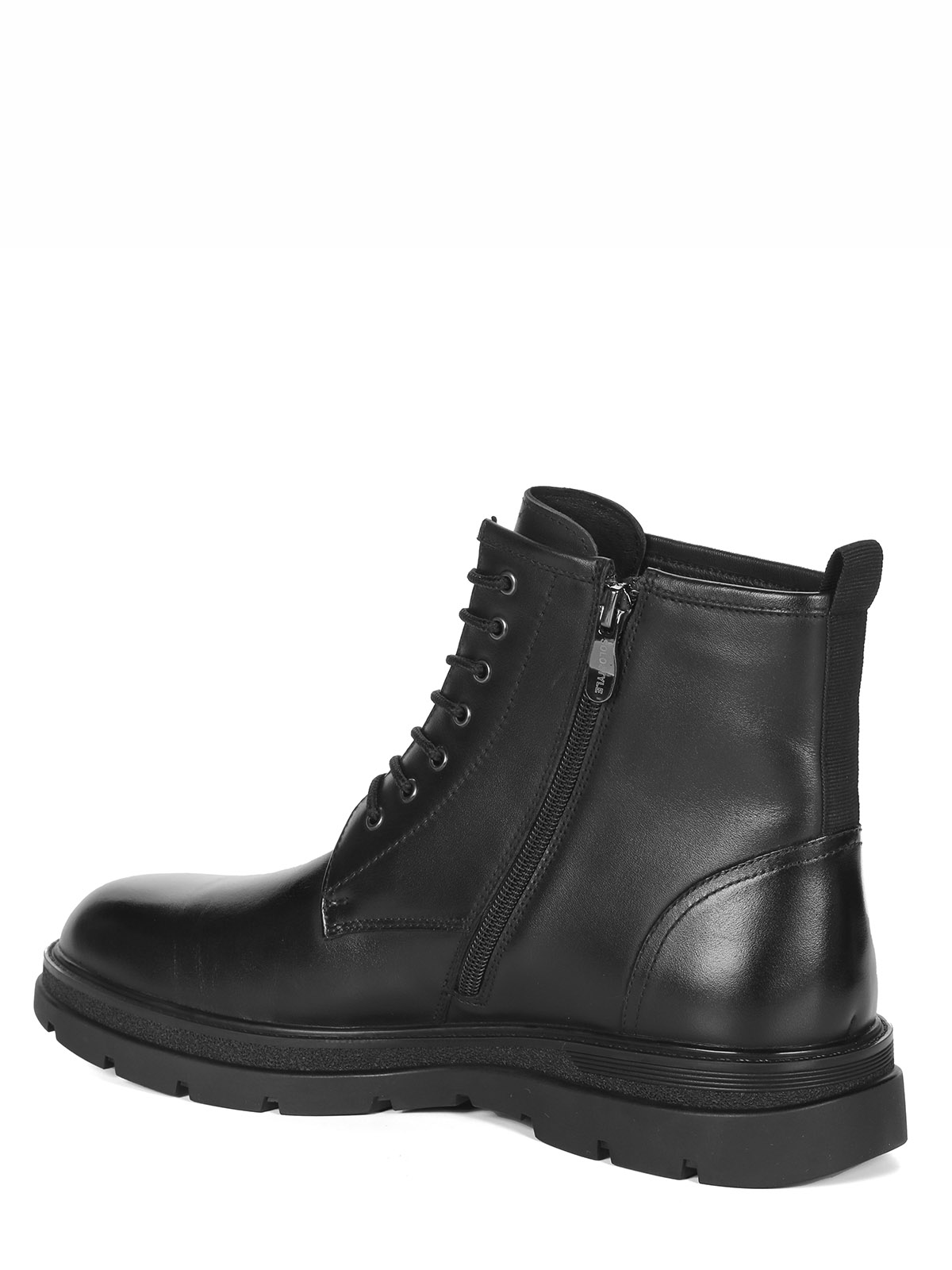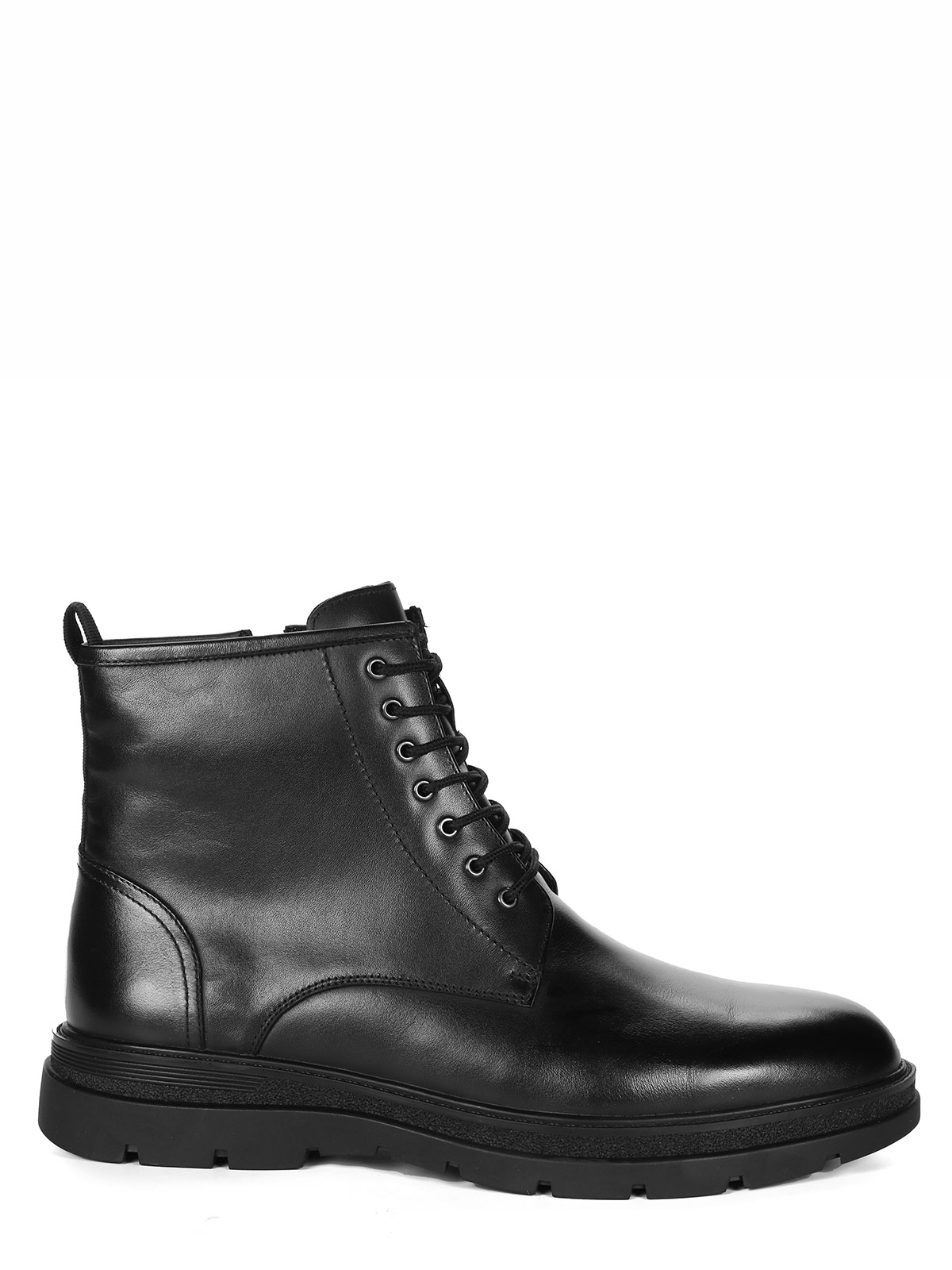 Мужские черные ботинки выполнены из натуральной кожи. Внутри - тёплая подкладка из натуральной шерсти для защиты от холода. На подошве есть глубокий протектор для надёжного сцепления с любой поверхностью и предотвращения скольжения.